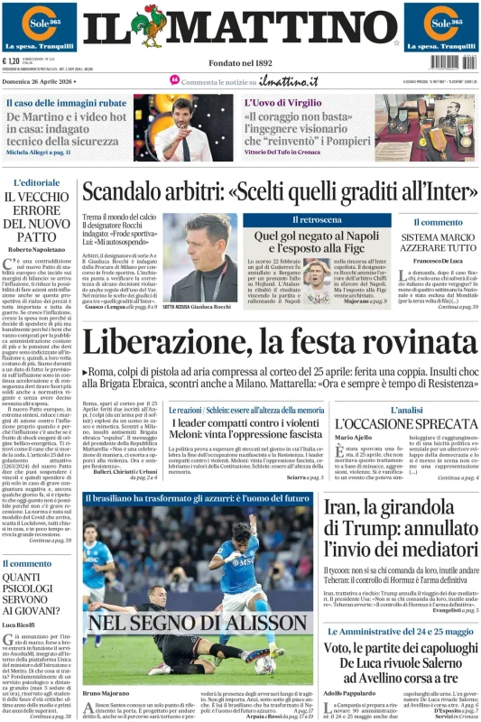 Il Napoli resta a guardare dal divano la Serie A dopo essere aver disputato contro la Cremonese la prima sfida della 34esima giornata. Sarà molto importante il risultato di Milan-Juventus. La vittoria contro i grigiorossi permette di stare tranquilli, ma una sconfitta o un pareggio dei rossoneri potrebbe aiutare gli azzurri a blindare il secondo posto. Intanto, l'AIA vive un terremoto con il designatore arbitrale Rocchi e Gervasoni indagati per frode sportiva. "Nel segno di Alisson", si legge sulla prima pagina de Il Mattino. Ecco la rassegna stampa di domenica 26 aprile 2026.