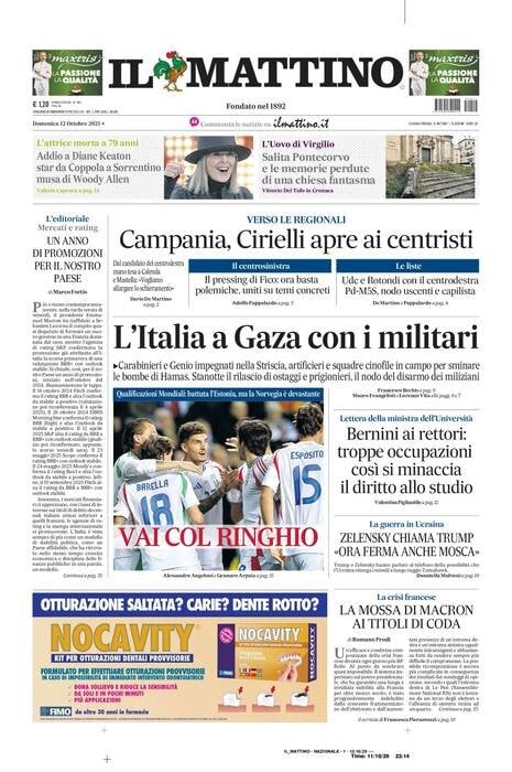 L'Italia dice quasi sicuramente addio ai play off, ma intanto non molla: contro l'Estonia a Tallinn gli azzurri vincono 1-3. Martedì ci sarà la sfida con Israele, decisiva per la qualificazione agli spareggi del Mondiale 2026. "Vai col Ringhio", si legge sulla prima pagina de Il Mattino. Ecco la rassegna stampa di domenica 12 novembre 2025.