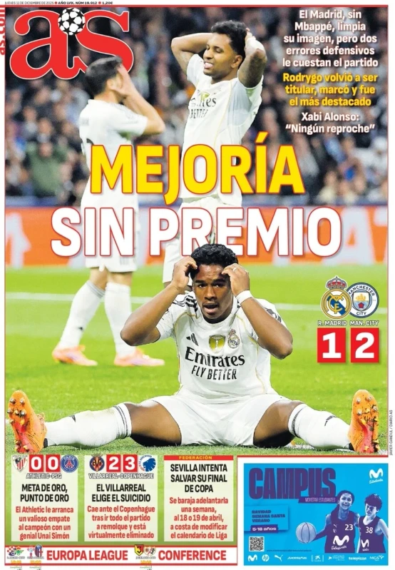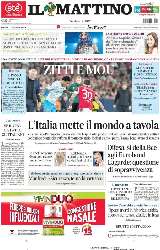 Il Mattino apre parlando della sconfitta del Napoli in Champions League contro il Benfica: "Zitti e Mou. Una notte poco Special. Azzurri sconfitti dal Benfica di Mourinho, ora playoff di Champions in salita".