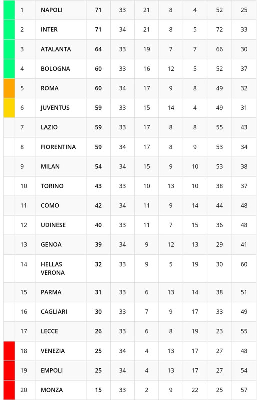 Cade ancora l'Inter: dopo la sconfitta contro il Bologna, ed il ko nel derby di Coppa Italia, arriva un'altra sconfitta in casa contro la Roma. I nerazzurri restano dunque a quota 71 punti, con il Napoli che avrà la possibilità di salire al primo posto in solitaria facendo punti contro il Torino. I giallorossi, invece, salgono a quota 60 punti agganciando il Bologna al quarto posto. Nell'altro match del pomeriggio la Fiorentina batte l'Empoli: i viola si portano a quota 59 punti agganciando Juventus e Lazio, mentre gli ospiti restano in piena zona retrocessione con 25 punti. Ecco la classifica provvisoria della Serie A: