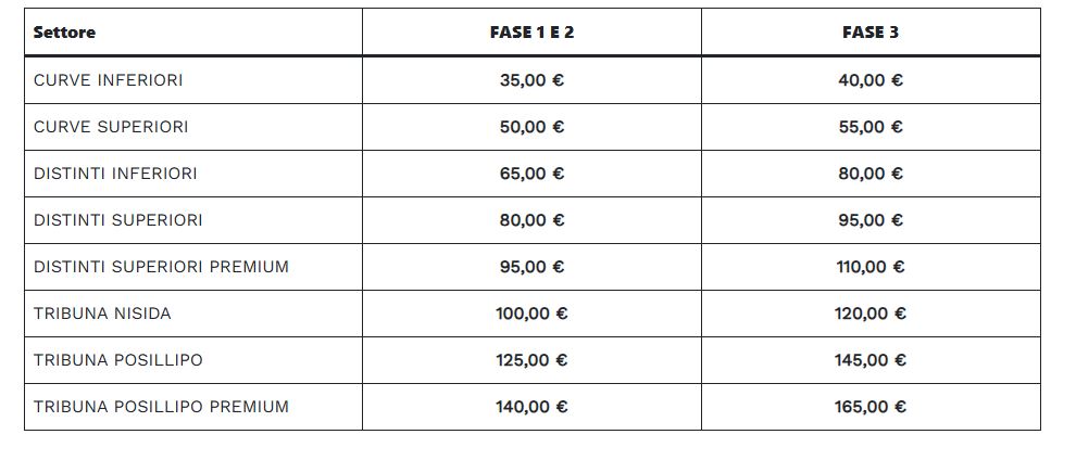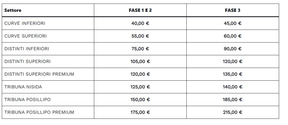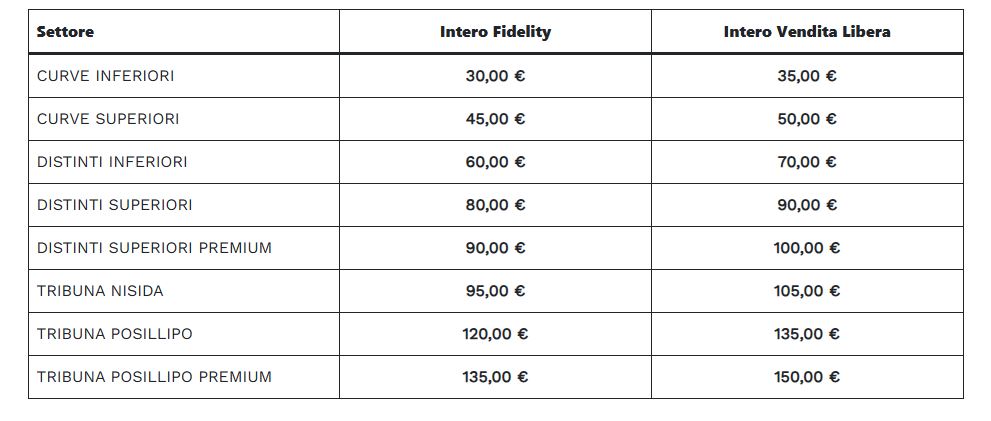 I prezzi per Napoli vs Inter saranno i seguenti: