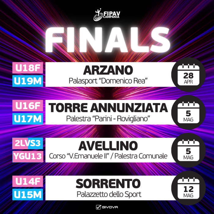 La palestra "Parini-Rovigliano" di Torre Annunziata sarà invece la sede delle finali U16 femminile (sarà Volley World contro Arzano) e U17 maschile (ancora da definire le finaliste) domenica 5 maggio. Nello stesso giorno, ad Avellino, si terranno le finali del secondo livello di Volley S3 Maschile e Femminile nel corso "Vittorio Emanuele II" e contestualmente, nella Palestra Comunale nei pressi dello Stadio Partenio, il Torneo Young Girl U13F (CS San Lorenzo, VolleyWorld, BCC Capaccio Paestum Serino e Partenope Volley le finaliste).
