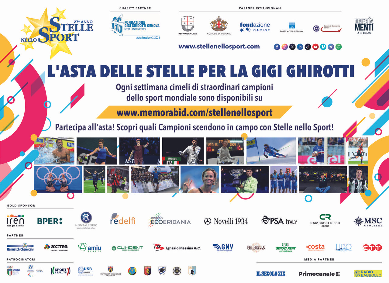 Su https://memorabid.com/stellenellosport è davvero una settimana speciale, dedicata ai collezionisti e agli appassionati, con una selezione di cimeli unici donati dai più grandi protagonisti delle scene nazionali e internazionali. Dalle leggende del motociclismo alle icone del tennis moderno, ogni oggetto racconta una storia di sacrificio, talento e generosità. L'intero ricavato è donato alla Fondazione Gigi Ghirotti ETS.