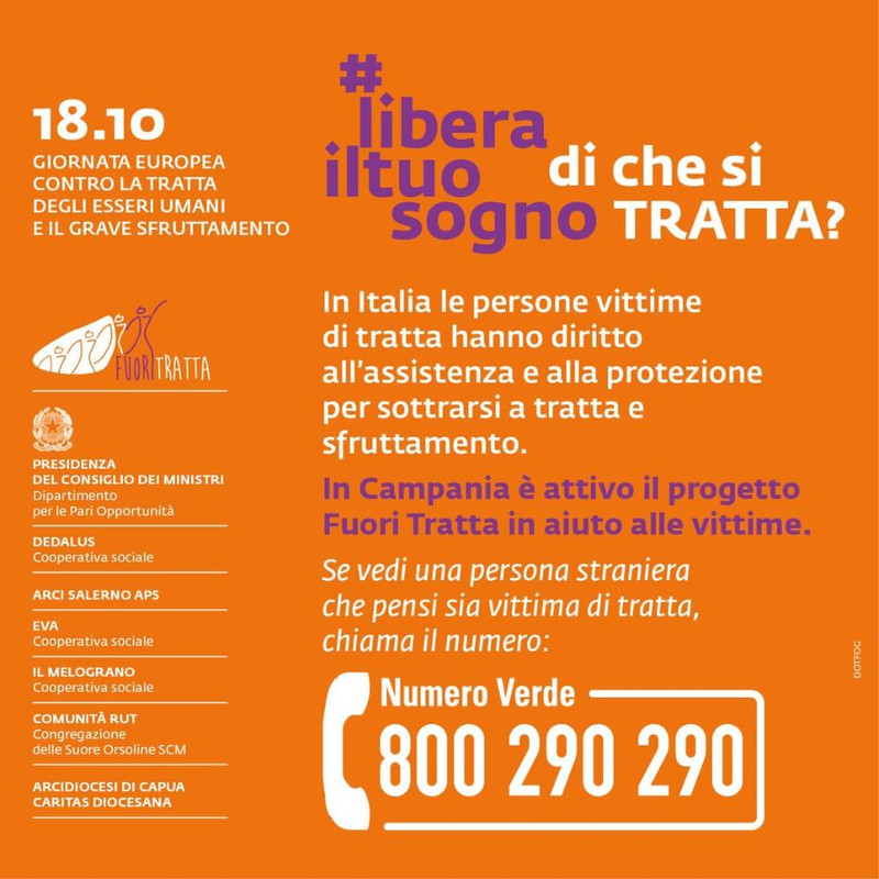 A Napoli, uno striscione che reca la scritta NAPOLI NON TRATTA #LIBERAILTUOSOGNO è stato affisso da Palazzo San Giacomo, sede del Comune, e striscioni omologhi, recanti la scritta della città di appartenenza verranno esposti a Salerno, Caserta, Avellino e Benevento, con annesse attività di sensibilizzazione sull’argomento.