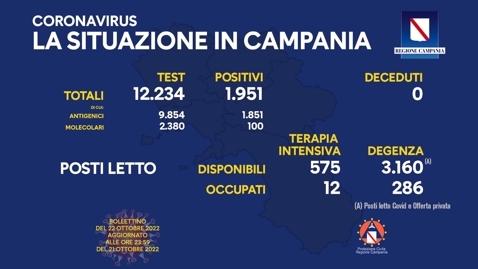 CORONAVIRUS - Regione Campania, 1.951 positivi su 12.234 tamponi e 0 morti nelle ultime 24 ore