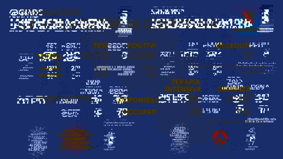 CORONAVIRUS - Regione Campania, 2.862 positivi su 16.715 tamponi nelle ultime 24 ore, 9 morti nelle ultime 48 ore, 1 deceduto in precedenza ma registrato ieri