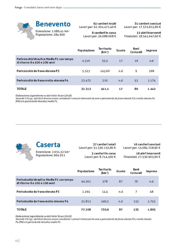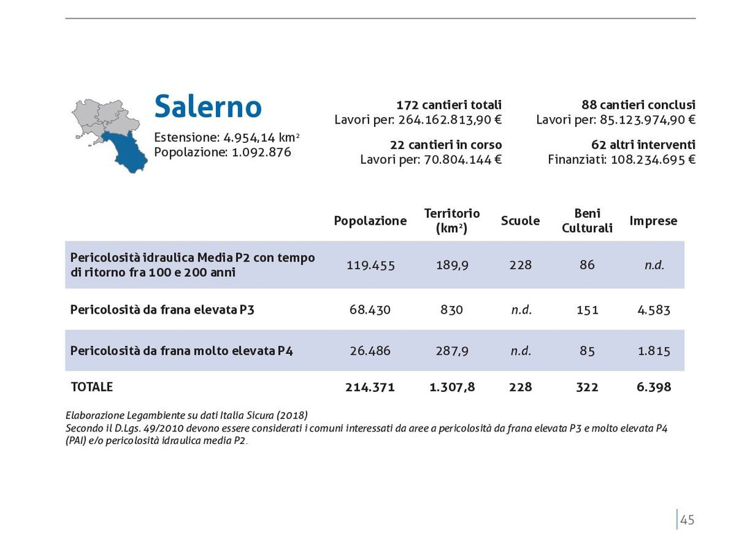 La provincia più a rischio è quella di Salerno dove sono esposti quotidianamente 214.371 persone (il 39,4% della popolazione a rischio della regione), seguita dalla provincia di Napoli (149.865 persone pari al 27,5%), Caserta (77.208 abitanti pari al 14,2%), Avellino (70.533 pari al 13%) ed infine Benevento (32.313 pari al 5,9%) . In Campania , secondo ultimo rapporto Ispra sul dissesto ideologico, gli edifici a rischio in aree a pericolosità da frana elevata e molto elevata sono 90.7889 (8,6% del totale). In Provincia di Salerno sono ben 32.199 (il 12,8% del totale) segue Napoli con 16.032(4,7%), Avellino con 19.373 edifici(13,1%) Caserta con 12.089 (11,2 %) e Benevento con 11.096 (5,7%). L’elevata diffusione del rischio idrogeologico in Campania ha portato negli ultimi decenni alla programmazione di 478 cantieri per “mettere in sicurezza il territorio”, di cui 57 risultano ancora in corso di esecuzione, 255 sono già conclusi e 166 riguardano altri interventi. Gli importi stanziati per questi progetti ammontano a 687,89 milioni di euro.( dati Italia Sicura 2018).