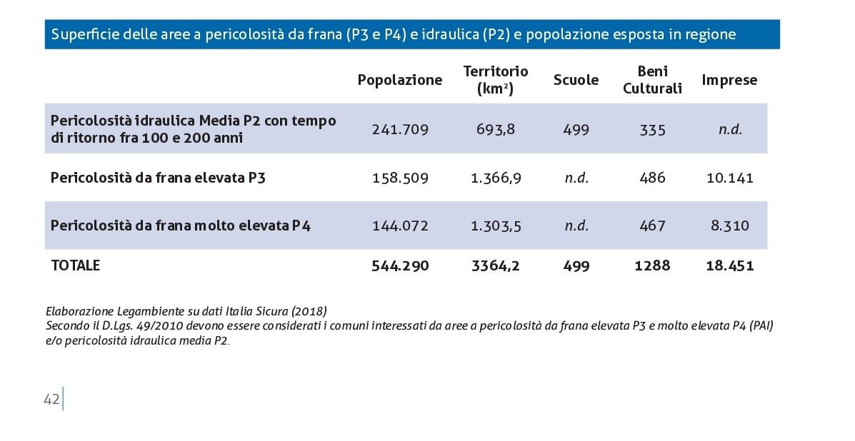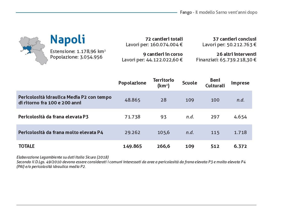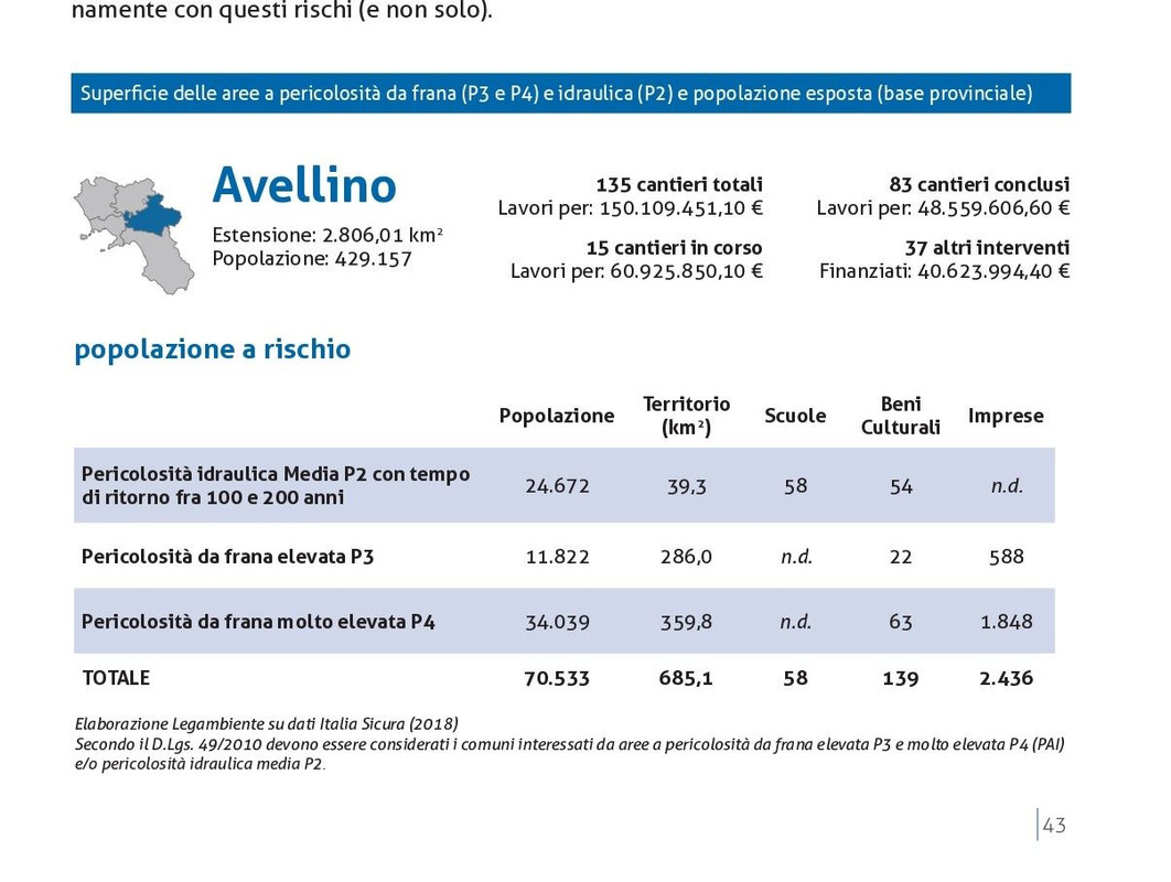 Una regione dai piedi di argilla e deturpata da cemento abusivo, dove le tragedie del passato, in primis Sarno, hanno insegnato poco o nulla per una regione, la Campania , che com'è noto presenta un elevato rischio idrogeologico. Dei 550 comuni presenti nella regione, sono 503 (il 91%) quelli in cui ricadono aree classificate a elevato rischio idrogeologico con una superficie di circa 3.338 kmq (il 24,4% della superficie regionale). In totale sono oltre 544 mila le persone residenti in questi territori (circa il 10% della popolazione residente nella regione) dove insistono 499 scuole, 1288 beni culturali e 18.451 imprese. All'indomani della frana che ha colpito Amalfi Legambiente presenta numeri, dati sul rischio idrogeologico, stato dei lavori, abusivismo in Campania.