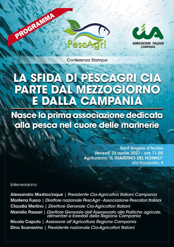 Pescagri Cia rappresentata dal presidente Antonino Algozino e dalla segretaria nazionale Marilena Fusco, è l’Associazione dei Pescatori Italiani che nasce per incentivare le attività di produzione primaria connesse alla pesca professionale ed acquacoltura, ivi compresi i servizi dedicati alla pesca sportiva. Al fine di continuare a valorizzare la filiera agroalimentare, PescAgri promuove la tutela, lo sviluppo, e la valorizzazione della pesca e dell’acquacoltura rispettando le specificità del territorio e le tradizioni storicoculturali, avvicinando le persone al settore ittico apportando un valore aggiunto alle aziende agroittiche dando loro un sostegno al reddito con informative sulle molteplici misure di finanziamento a livello regionale, ministeriale ed europeo. L’azione di Pescagri è supportata dalla Cia-Agricoltori Italiani rappresentata dal presidente Dino Scanavino e dalla direttrice generale Claudia Merlino di Cia-Agricoltori Italiani è una delle più grandi organizzazioni professionali agricole in Europa e in Italia. Rappresenta oltre 900.000 iscritti a titolo principale, coltivatori diretti ed imprenditori agricoli. La sua sede nazionale è a Roma e vanta una presenza capillare su tutto il territorio nazionale, arrivando ad essere presente in circa 5000 comuni, con sedi regionali, provinciali e zonali. In Campania la Confederazione è rappresentata dal presidente Alessandro Mastrocinque e dal direttore generale Mario Grasso. Si articola su due livelli: regionale e provinciale. Il primo svolge funzioni di indirizzo, coordinamento e controllo verso le strutture provinciali al fine di assicurare l’unitarietà di orientamento e la conformità alle linee politico-programmatiche congressuali, nonché il rispetto delle regole democratiche, dello statuto, dei regolamenti interni e delle deliberazioni adottate dagli organi confederali. Il livello provinciale invece, realizza la direzione di tutto l’ambito territoriale provinciale. Le strutture provinciali sono dotate di piena autonomia funzionale, economica, patrimoniale e finanziaria e ciascuna di esse risponde direttamente del proprio operato economico, finanziario e delle obbligazioni verso terzi
