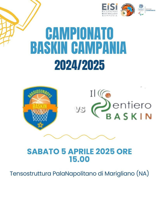 Domani pomeriggio alle 15.00 si parte al PalaNapolitano di Marigliano. Nella tensostruttura del palazzetto, andrà in scena il match tra Raggio SunBoys Baskin e Il Sentiero Baskin. La formazione di coach Crescenzo D'Amore arriva alla gara con cinque vittorie e due sconfitte mentre i salernitani fino ad ora hanno collezionato 3 vittorie e due sconfitte.