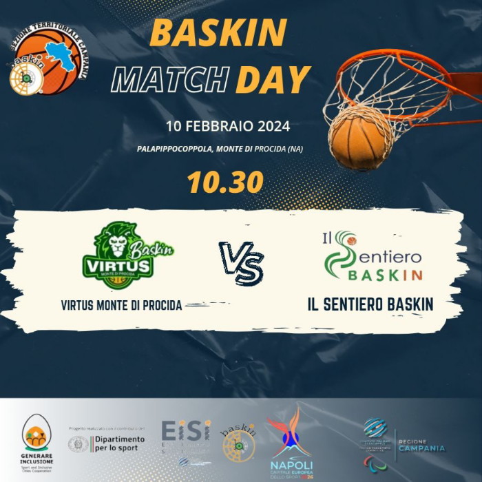 Torna in campo il grande Baskin. Appuntamento fissato per sabato mattina alle 10.30 al PalaPippoCoppola di Monte di Procida per la gara tra Virtus Baskin Monte di Procida e Sentiero Baskin. Per entrambe le squadre è la terza partita di questo campionato. La formazione montese arriva al match dopo la sconfitta subita sul campo della Cestistica Ischia e la vittoria nel match inaugurale contro Baskinsieme Napoli. Il Sentiero Baskin affronta la gara da imbattuto: il team guidato da Annalia Cutolo, alla terza trasferta consecutiva, è reduce dai successi ottenuti contro Raggio Sunbaskin Marigliano e Baskinsieme. Sarà il primo confronto assoluto tra i due team. Da un lato la voglia di tornare a vincere, dall'altro quella di restare in vetta.