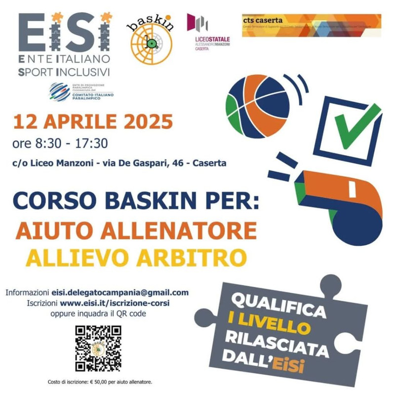 Sabato mattina al Liceo Manzoni in Via De Gaspari, a Caserta, dalle 8.30 si terrà per la prima volta il Corso di Formazione per Allenatori e Arbitri Baskin, tenuto dal Formatore Nazionale Vittorio Scotto di Carlo e dal Formatore Nazionale Arbitri , nonché Responsabile Nazionale Arbitri, Emilio Chiarugi.