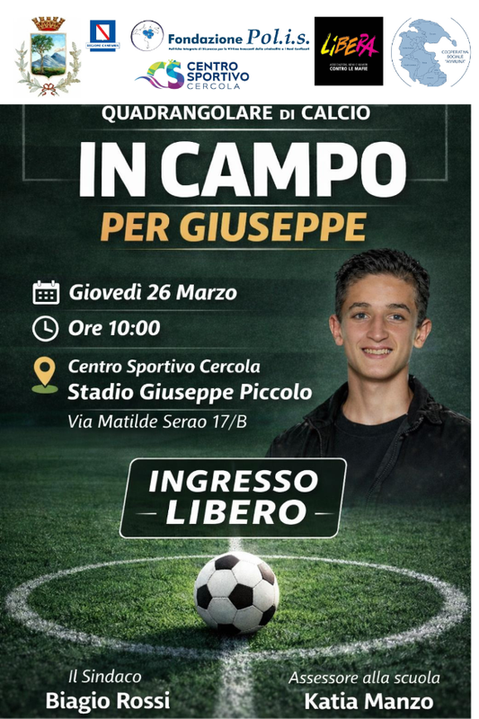 Giovedì 26 marzo, alle ore 10, allo Stadio “Giuseppe Piccolo” di Cercola (via Matilde Serao, 17/B), si terrà un torneo quadrangolare di calcio in ricordo di Giuseppe Piccolo, vittima innocente della camorra, ferito a Cercola, in Piazza Libertà, il 27 marzo del 1991 e morto il 31 marzo successivo.