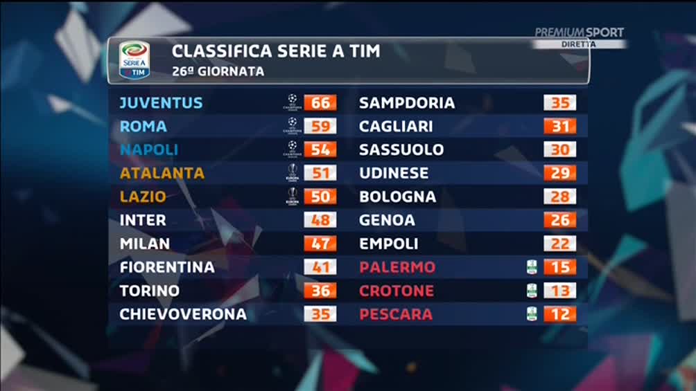 Ecco la classifica del 26° turno del campionato di serie A dopo il pari tra Fiorentina e Torino per 2-2.
