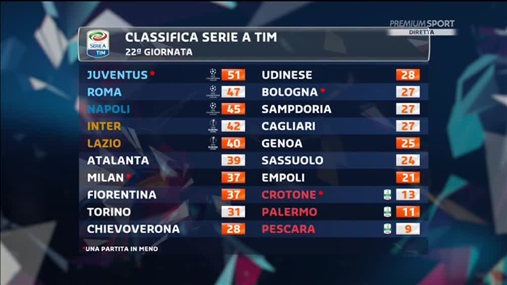 La Fiorentina sale a 37 punti in classifica. Ecco la graduatoria.