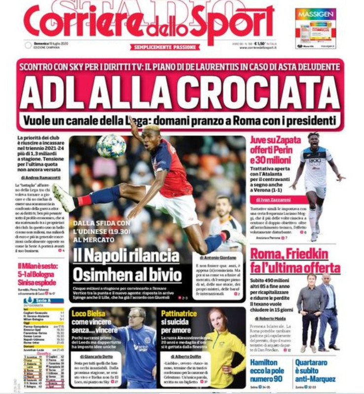"ADL alla crociata, vuole un canale della Lega: domani pranzo a Roma con i presidenti. Scontro con Sky per i diritti tv. Il piano di De Laurentiis in caso di asta deludente". Così titola l'edizione campana del Corriere dello Sport. Al centro si parla di mercato: "Il Napoli rilancia, Osimhen al bivio".