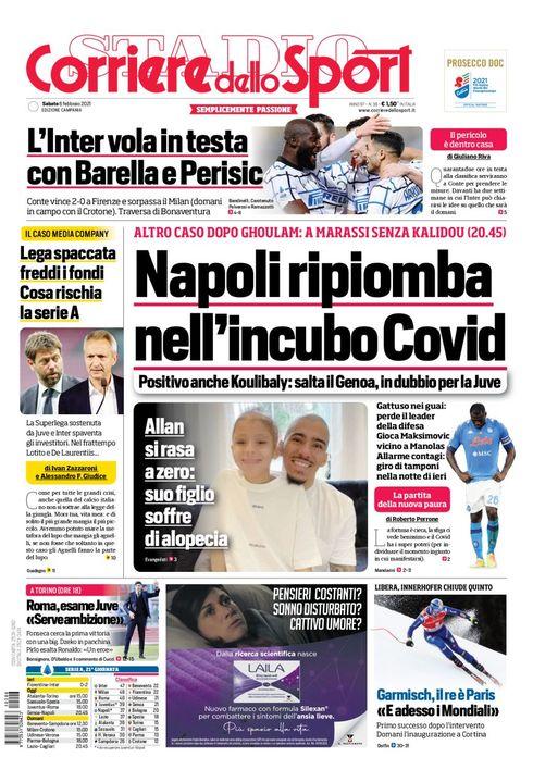 Il Corriere dello Sport, nella sua edizione Campania, apre in prima pagina con le notizie in casa Napoli dopo i tamponi positivi di Ghoulam e Koulibaly: “Napoli ripiomba nell’incubo Covid. Positivo anche Koulibaly: salta il Genoa, in dubbio per la Juve". In taglio alto si parla del successo dell'inter di Conte contro la Fiorentina: "L'Inter vola in testa con Barella e Perisic".