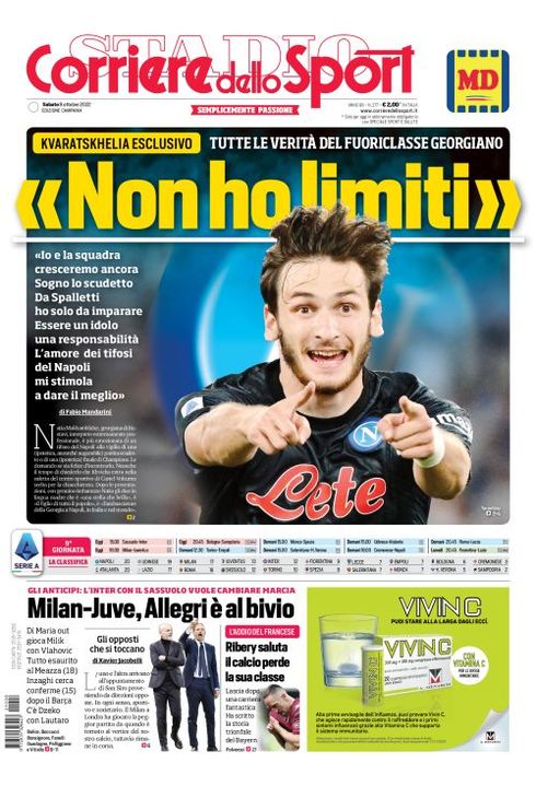 Sul Corriere dello Sport, edizione Campania, spazio all'intervista a Kvaratskhelia: "Non ho limiti".