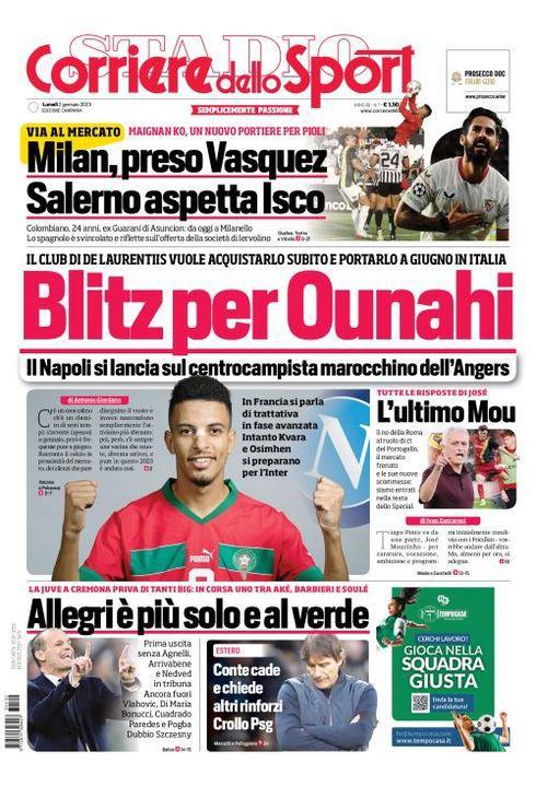 Il Corriere dello Sport, nella sua edizione Campania, apre in prima pagina con il Napoli: "Blitz per Ounahi. Il Napoli si lancia sul centrocampista marocchino dell'Angers. Il club di De Laurentiis vuole acquistarlo subito e portarlo a giugno in Italia. In Francia di parla di trattativa in fase avanzata. Intanto Kvara e Osimhen si preparano per l'Inter".