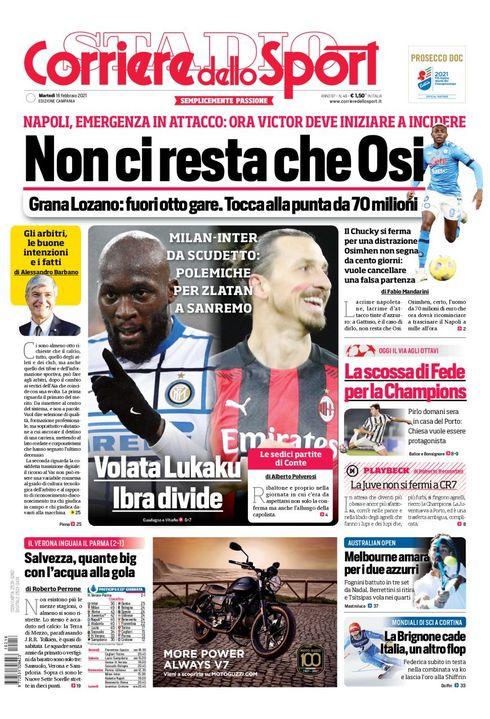 Il Corriere dello Sport, nella sua edizione Campania, apre in prima pagina con l'importanza di Osimhen vista l'emergenza dovuta ai tanti infortuni: "Non ci resta che Osi. Grana Lozano: fuori otto gare. Tocca alla punta da 70 milioni".