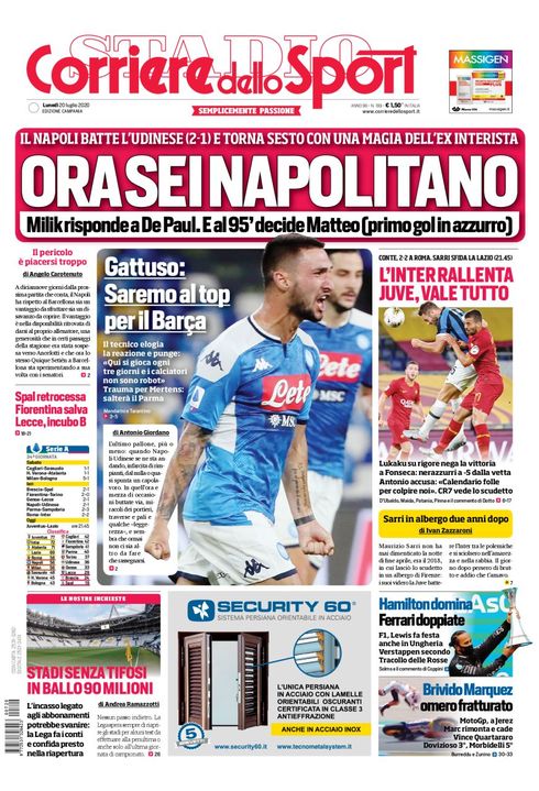 Sul Corriere dello Sport, edizione Campania, si celebra il gol vittoria di Politano all'Udinese. "Ora sei NaPolitano", poi spazio alle parole di Gattuso in chiave Barcellona.