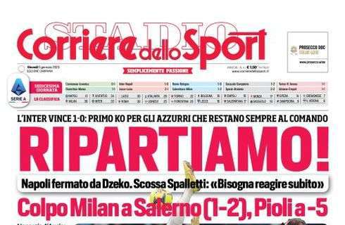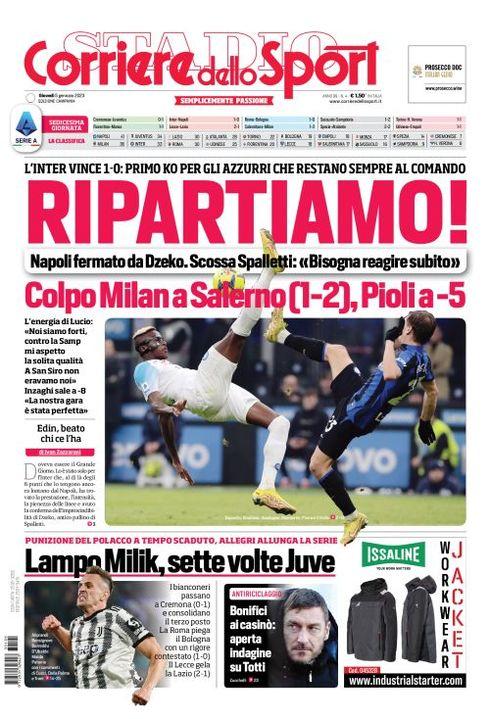 "Ripartiamo!", titola così il Corriere dello Sport, nella sua edizione Campania, dopo la sconfitta del Napoli a Milano contro l'Inter: "Napoli fermato da Dzeko. Scossa Spalletti: 'Bisogna reagire subito'. L'energia di Lucio: 'Non siamo forti, contro la Samp mi aspetto la solita qualità. A San Siro non eravamo noi'. Inzaghi sale a -8: "La nostra gara è stata perfetta'".
