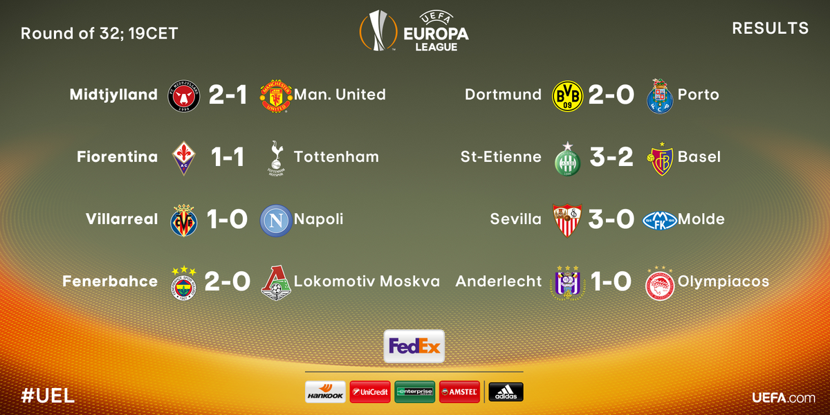 Sconfitta per il Napoli, pareggio per la Fiorentina: questo l'esito delle partite di andata dei sedicesimi di finale di Europa League. Gli spagnoli del Villarreal battono la squadra di Sarri per 1-0 grazie ad una punizione di Denis Suarez a otto minuti dalla fine. A Firenze ei viola non vanno oltre l'1-1 con il Tottenham. Inglesi in vantaggio al 37' con un rigore di Chadli e concesso per fallo di Tomovic su Davies. La Fiorentina cambia marcia nella ripresa e trova il pareggio al 59' con un gran tiro dalla distanza di Bernardeschi. Le partite di ritorno giovedì 25 febbraio. Nel seguente schema pubblicato su Twitter da Uefa Europa League, ecco i risultati delle altre gare.