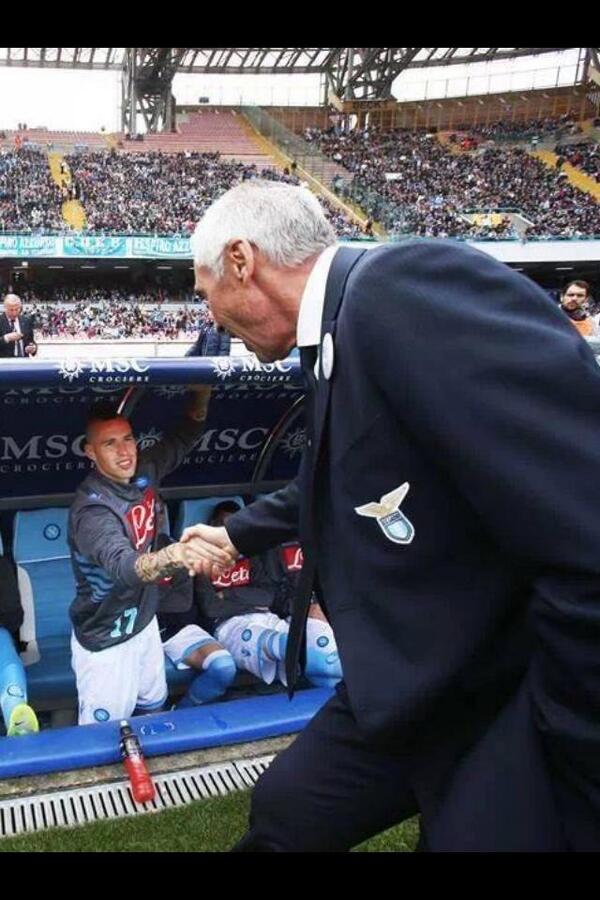 "#Napoli in una stretta di mano tutta la gratitudine di un giovane verso il suo maestro, onore a #Reja e a #Hamsik", scrive su Twitter il direttore di "Napoli Magazine", Antonio Petrazzuolo.
