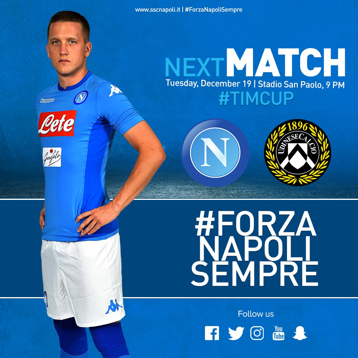 "December 19 - 9 PM Stadio San Paolo #NapoliUdinese #TIMcup #ForzaNapoliSempre", ecco una foto pubblicata su Twitter dalla SSC Napoli in cui si vede il centrocampista azzurro Zielinski.