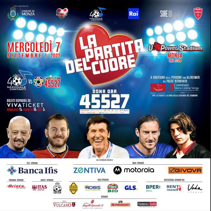 La Partita del Cuore, il più importante evento italiano di sport, spettacolo e solidarietà, alla sua 31ª edizione, torna con la sua magica atmosfera. Mercoledì 7 settembre, alle ore 21.15, l’U-Power Stadium di Monza (ex Brianteo) ospita la sfida tra la Nazionale Cantanti e il Charity Team 45527. L’incontro sarà trasmesso in diretta su Rai 2, in collaborazione con Rai Sport e Rai per la Sostenibilità, con la telecronaca di Alberto Rimedio, la voce della Nazionale italiana, e il commento tecnico di Daniele Adani. A condurre la serata, Simona Ventura, volto di punta di Rai 2, capace di coniugare nel migliore dei modi i momenti di sport e spettacolo. A bordocampo, Leonardo, Gianni Bugno e Antonio Cabrini. Tutto il ricavato dell’evento, frutto della vendita dei 16mila biglietti disponibili e delle donazioni da rete fissa e mobile al numero 45527, che è possibile effettuare fino al 18 settembre, sarà a sostegno delle persone con Alzheimer del Paese Ritrovato de “La Meridiana Società Cooperativa Sociale” e in favore dei bambini del “Comitato Maria Letizia Verga per lo studio e la cura della leucemia del bambino”. È possibile donare 2 Euro per ciascun SMS inviato al numero 45527 da cellulari WINDTRE, TIM, Vodafone, Poste Mobile, Coop Voce, Tiscali oppure donando 5 o 10 Euro da rete fissa TIM, Vodafone, WINDTRE, Fastweb e Tiscali, 5 Euro per le chiamate da rete fissa TWT, Convergenze, Poste Mobile. La Nazionale Cantanti, allenata da Sandro Giacobbe, annovera tra le sue fila Enrico Ruggeri, Gianni Morandi, Francesco Totti, Gabriel Omar Batistuta, Alessandro Cattelan, Sangiovanni, Rkomi, Ubaldo Pantani, Paolo Vallesi, Bugo, Boosta, Moreno e ZW Jackson. Il Charity Team, guidato da Stefano Mei, risponde invece con Stefano Domenicali, Marco Melandri, Fabio Galante, Pecco Bagnaia, Luca Marini, Junior Cally, Pierpaolo Pretelli, Toni Cairoli, Marco Simone, Dj Ringo, Fabio Aru, Nicola Bartolini e Aldo Baglio. La prevendita dell'evento è sul sito www.vivaticket.com e nei punti vendita VivaTicket di tutta Italia. I biglietti di curva nord e sud al prezzo di 5 Euro, quelli di tribuna est a 10 Euro e tribuna ovest a 15 Euro. Per i biglietti venduti in prevendita potrebbe essere aggiunto un costo di transazione e gestione sistema. I biglietti riservati ai diversamente abili e ai loro accompagnatori saranno invece gratuiti: per tutte le informazioni e prenotazioni degli stessi scrivere all’indirizzo email biglietti@cooplameridiana.it. L’hashtag per l’evento di quest’anno sarà: #partitadelcuore2022. La storia della Nazionale Cantanti La “Associazione Nazionale Italiana Cantanti” nasce nel 1981, fortemente voluta da un gruppo di cantanti e dal D.G. Gianluca Pecchini, con lo scopo di promuovere e sostenere progetti di solidarietà, opere e interventi per la protezione e la tutela dei più deboli e bisognosi. È una organizzazione formata da alcuni dei più prestigiosi protagonisti della musica italiana che, riunendosi spontaneamente, hanno deciso di impegnare la loro immagine di artisti e sportivi in un progetto di solidarietà a lunga scadenza. Nella primissima formazione della squadra ha giocato anche Lucio Battisti. La prima Partita del cuore della Nazionale Cantanti si è disputata nel 1991 all’Arena di Milano con più di 83.000 persone sugli spalti. Quest’anno la Partita del Cuore compie 30 anni e debutta sulle Reti Mediaset. Negli anni, la squadra ha sostenuto associazioni con donazioni che superano i 100 MILIONI DI EURO. All’evento, che si è trasformato in un tradizionale e annuale appuntamento televisivo, hanno preso parte (in campo o in tribuna), tantissimi personaggi di spicco dello spettacolo (Richard Gere, Sean Connery), del calcio (Pelè, Maradona, Zinedine Zidane, Roberto Baggio), della musica (Rod Stewart, Liam Gallagher), dello sport (Michael Schumacher, Valentino Rossi) e anche della politica: la scena di Gianfranco Fini che applaude a un gol di Massimo D’Alema ha fatto il giro del mondo. In tribuna hanno presenziato personaggi quali Michail Gorbaciov e il Dalai Lama, grande sostenitore della Nazionale Cantanti. È rimasto negli annali l’incontro, l’ultimo, (alla Partita del Cuore del 2000) tra il Presidente dello Stato d’Israele, Shimon Peres, e il presidente dell’Autorità Nazionale Palestinese, Yasser Arafat. “La Partita del Cuore” della Nazionale Italiana Cantanti ha oltrepassato spesso i confini nazionali giocando anche in Inghilterra, Russia, Romania, Ungheria, Polonia, Ucraina, Israele, Iraq e perfino a Sarajevo, durante la guerra dei Balcani. L’Associazione “La Partita del Cuore – Umanità senza Confini Onlus” L’Associazione “La Partita del Cuore – Umanità senza Confini Onlus” nasce nel 2005 per volontà dell‘Associazione Nazionale Italiana Cantanti al fine di raccogliere fondi da destinare alla realizzazione di importanti progetti di solidarietà e di aiuto diretto e concreto a chi è stato meno fortunato, in Italia e nel mondo. L’Associazione è l’organizzatore ufficiale dello storico evento “La Partita del Cuore”, nato nel 1992. Grazie anche all’impegno della vicepresidente dott.ssa Titti Quaggia, sono stati raccolti, e interamente devoluti, più di cento milioni di euro, attraverso gli eventi che l’Associazione ha promosso e organizzato: fra tutti la Partita del Cuore, il tradizionale appuntamento che vede protagonista la Nazionale Italiana Cantanti e dove l’Associazione costituisce e rappresenta il vero centro di raccolta fondi. Tutte le persone coinvolte nell’Associazione e all’interno degli eventi e dei progetti realizzati dall’Associazione stessa, si impegnano pro bono quotidianamente nel raggiungimento degli obiettivi comuni, a sostegno delle persone meno fortunate. Da sempre l’Associazione sostiene la valorizzazione delle diversità e l’inclusione intese come opportunità per creare valore.
