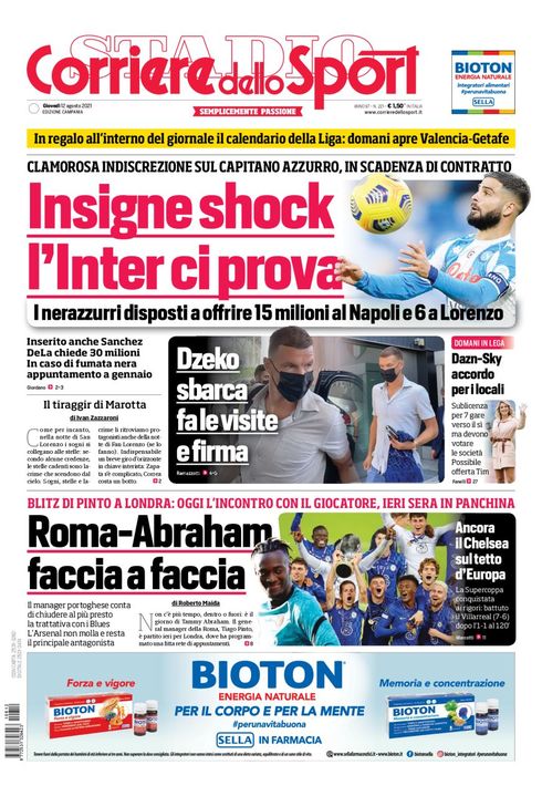 "Insigne shock, l'Inter ci prova", titola l'edizione campana del Corriere dello Sport, che prosegue: "I nerazzurri disposti a offrire 15 milioni al Napoli e 6 a Lorenzo". Spazio in seguito alle visite mediche di Dzeko con l'Inter e alla contromossa della Roma: "Roma-Abraham, faccia a faccia".