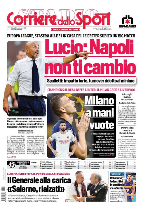 "Lucio: Napoli non ti cambio. Europa League, stasera alle 21 in casa del Leicester subito un big match. Spalletti: impatto forte, turnover ridotto al minimo". È questo il titolo di apertura del Corriere dello Sport, nell'odierna edizione Campania, in vista del debutto europeo dei partenopei al King Power Stadium.