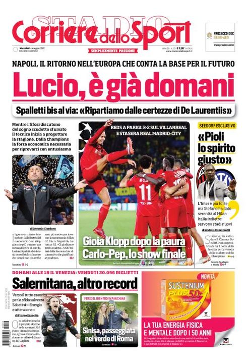 Il Corriere dello Sport, nell'edizione campana, apre con la programmazione da parte del Napoli in vista del prossimo anno: "Lucio, è già domani. Napoli, il ritorno nell'Europa che conta la base per il futuro. Spalletti bis al via: "Ripartiamo dalle certezze di De Laurentiis. Mentre i tifosi discutono del sogno scudetto sfumato il tecnico inizia a progettare la stagione. Dalla Champions la forza economica necessaria per riprovarci con entusiasmo".