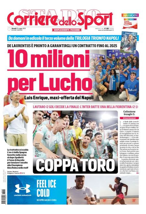 Il Corriere dello Sport, edizione Campania, ha dedicato spazio in prima pagina al Napoli: "10 milioni per Lucho. Luis Enrique, maxi-offerta del Napoli. De Laurentiis è pronto a garantirgli un contratto fino al 2025". C'è spazio anche per la finale di Coppa Italia: "Coppa Toro. Lautaro (2 gol) decide la finale: l'Inter batte una bella Fiorentina (2-1)".