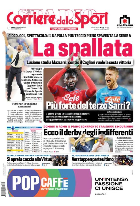 Il Corriere dello Sport, nell'edizione Campania, apre in prima pagina con gli azzurri: "Gioco, gol e spettacolo: il Napoli a punteggio pieno spaventa la Serie A. La spallata. Luciano studia Mazzarri: contro il Cagliari vuole la sesta vittoria".