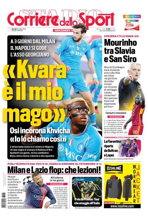 Il Corriere dello Sport, edizione Campania, dedica spazio in prima pagina alle parole di Osimhen: "Kvara è il mio mago. A 3 giorni dal Milan, il Napoli si gode l'asso georgiano, Osi incorona Khvicha: "Io lo chiamo così".