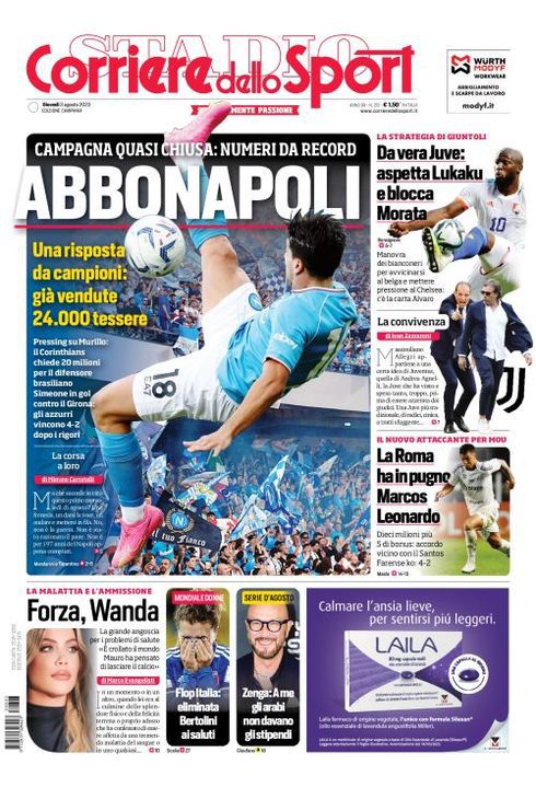 Il Corriere dello Sport, edizione Campania, ha dedicato spazio in prima pagina al Napoli: "AbboNapoli. Campagna quasi chiusa: numeri da record. Una risposta da campioni: già vendute 24.000 tessere".