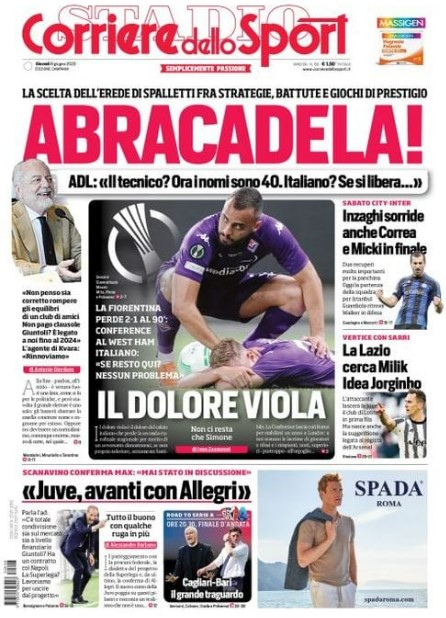 Il Corriere dello Sport, edizione Campania, ha dedicato spazio in prima pagina al Napoli: "Abracadela! La scelta dell'erede di Spalletti fra strategie, battute e giochi di prestigio. ADL: "Il tecnico? Ora i nomi sono 40. Italiano? Se si libera...". C'è spazio anche per la finale persa dalla Fiorentina: "Il dolore Viola. La Fiorentina perde 2-1 al 90': Conference al West Ham".