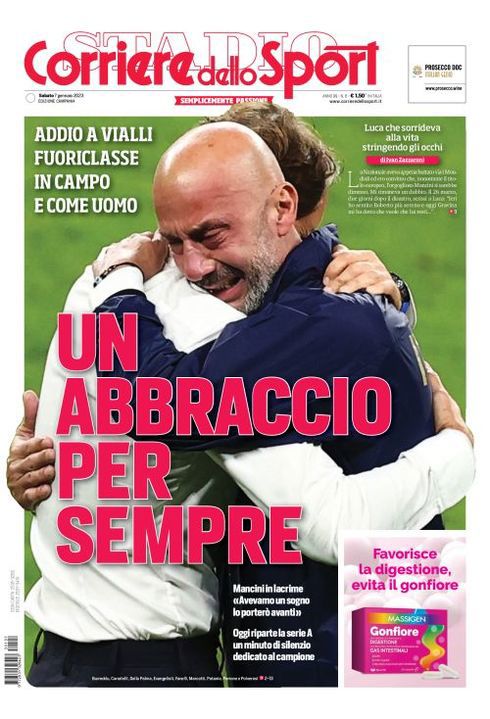 Il Corriere dello Sport, nell'edizione campana, apre con l'addio a Gianluca Vialli scomparso nelle scorse ore: "Un abbraccio per sempre. Addio a Vialli, fuoriclasse in campo e come uomo".