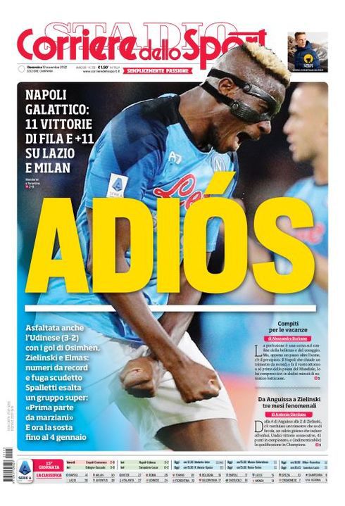 Il Corriere dello Sport, nell'edizione campana, apre con "Adiòs". Napoli galattico: 11 vittorie di fila e +11 su Lazio e Milan. Asfaltata anche l'Udinese (3-2) con i gol di Osimhen, Zielinski e Elmas: numeri da record e fuga scudetto. Spalletti esalta un gruppo super: "Prima parte da marziani". E ora la sosta fino al 4 gennaio.