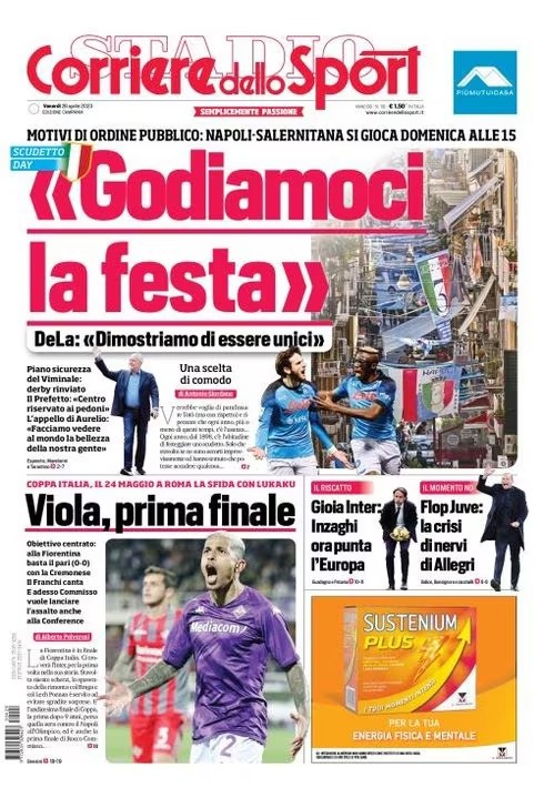 Il Corriere dello Sport, nell'edizione campana, apre con le parole di Aurelio De Laurentiis: "Godiamoci la festa". Motivi di ordine pubblico: Napoli-Salernitana si gioca domenica alle 15. DeLa: "Dimostriamo di essere unici". Piano sicurezza del Viminale: derby rinviato. Il Prefetto: "Centro riservato ai pedoni". L'appello di Aurelio: "Facciamo vedere al mondo la bellezza della nostra gente".