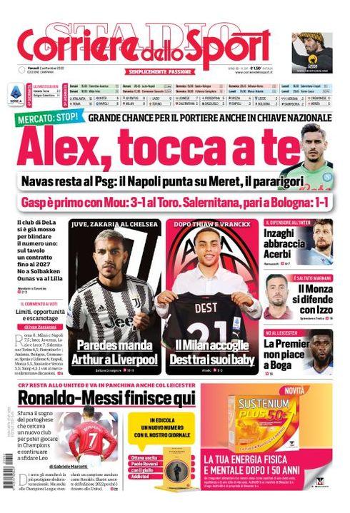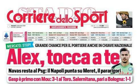 Il Corriere dello Sport, nell'edizione campana, apre con "Alex, tocca a te". Grande chance per il portiere anche in chiave nazionale. Navas resta al PSG: il Napoli punta su Meret, il pararigori. Il club di DeLa si è già mosso per blindare il numero uno: sul tavolo un contratto fino al 2027. No a Solbakken, Ounas va al Lille.