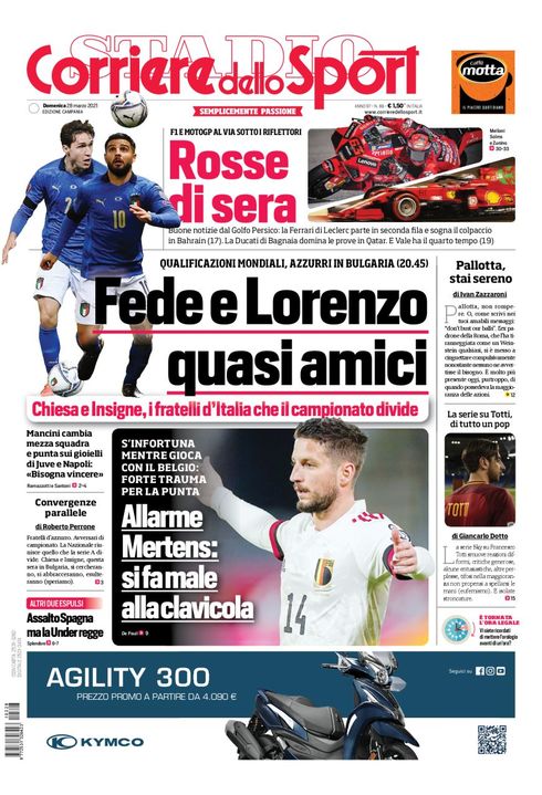 "Fede e Lorenzo quasi amici", così titola la prima pagina del quotidiano Il Corriere dello Sport nella sua edizione Campania. "Qualificazioni Mondiali, azzurri in Bulgaria. Chiesa e Insigne, i fratelli d'italia che il campionato divide". Spazio anche a Dries Mertens.