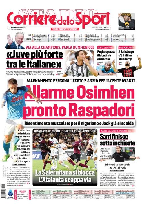 Il Corriere dello Sport, nell'edizione campana, apre con "Allarme Osimhen, pronto Raspadori". Allenamento personalizzato e ansia per il centravanti. Risentimento muscolare per il nigeriano e Jack già si scalda. Stamattina la decisione, dopo l'ultima seduta: Spalletti va incontro al Liverpool di Klopp con un dubbio in attacco, ma Osi spera.