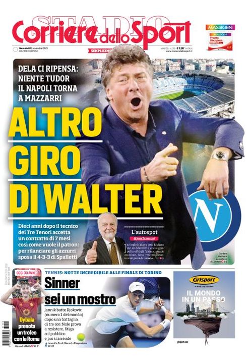 Il Corriere dello Sport, nell'edizione campana, apre parlando del ritorno sulla panchina del Napoli di Walter Mazzarri: "Altro giro di Walter. DeLa ci ripensa: niente Tudor, il Napoli torna a Mazzarri. Dieci anni dopo il tecnico dei Tre Tenori accetta un contratto di 7 mesi così come vuole il patron: per rilanciare gli azzurri sposa il 4-3-3 di Spalletti".