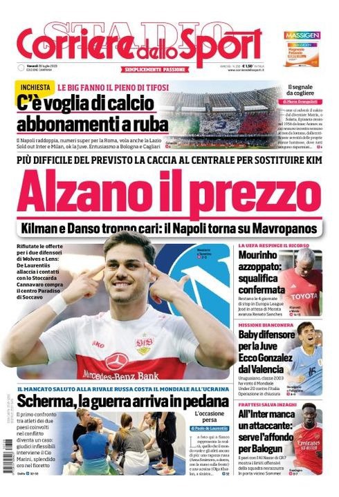Il Corriere dello Sport, nell'edizione campana, apre con "Alzano il prezzo". Più difficile del previsto la caccia al centrale per sostituire Kim. Kilman e Danso troppo cari: il Napoli torna su Mavropanos. Rifiutate le offerte per i due difensori di Wolves e Lens: De Laurentiis allaccia i contatti con lo Stoccarda. Cannavaro compra il Centro Paradiso di Soccavo. In alto, focus sugli abbonamenti: "C'è voglia di calcio, abbonamenti a ruba". Le big fanno il pieno di tifosi. Il Napoli raddoppia, numeri super per la Roma, vola anche la Lazio. Sold out Inter e Milan, ok la Juve. Entusiasmo a Bologna e Cagliari.