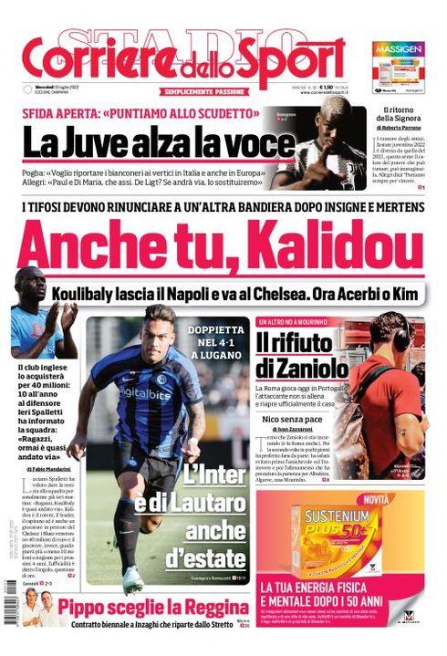 Il Corriere dello Sport, nell'edizione campana, apre con l'ormai imminente passaggio di Kalidou Koulibaly al Chelsea: "Anche tu, Kalidou. Koulibaly lascia il Napoli e va al Chelsea. Ora Acerbi o Kim. I tifosi devono rinunciare a un'altra bandiera dopo Insigne e Mertens. Il club inglese lo acquisterà per 40 milioni: 10 all'anno al difensore. Ieri Spalletti ha informato la squadra: "Ragazzi, ormai è quasi andato via".