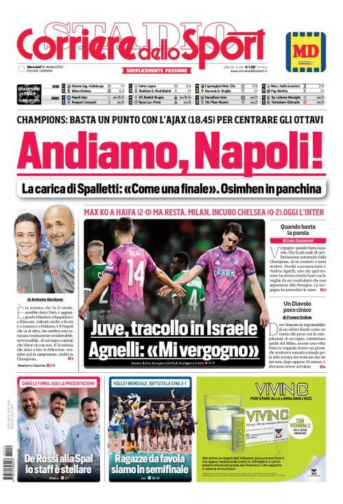 Il Corriere dello Sport, nell'edizione campana, apre con le parole dell'allenatore azzurro Luciano Spalletti alla vigilia del match di Champions League contro l'Ajax al Maradona: "Andiamo, Napoli! La carica di Spalletti: "Come una finale". Osimhen in panchina. Champions: basta un punto con l'Ajax (18:45) per centrare gli ottavi".