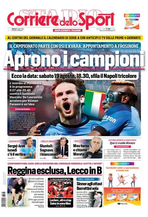 Il Corriere dello Sport, nell'edizione campana, apre parlando dell'esordio in campionato del Napoli campione d'Italia dopo la programmazione degli anticipi e dei posticipi delle prime 4 giornate della prossima Serie A: "Aprono i campioni. Ecco la data: sabato 19 agosto, ore 18:30, sfila il Napoli tricolore. Il campionato parte con Osi e Kvara: appuntamento a Frosinone. L'esordio al Maradona è in programma il 27 alle 20:45 contro il Sassuolo. Mercato: De Laurentiis accelera per Kilman. Faraoni è un'idea".