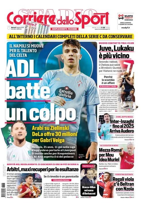 Il Corriere dello Sport, nell'edizione campana, apre con "ADL batte un colpo". Arabi su Zielinski, De Laurentiis offre 30 milioni per Gabri Veiga. Il Napoli si muove per il talento del Celta. Mezzala, 21 anni, 11 gol nella Liga. Klopp voleva portarlo al Liverpool. Si insiste anche per Koopmeiners. L'Al Ahli aspetta il si del polacco.